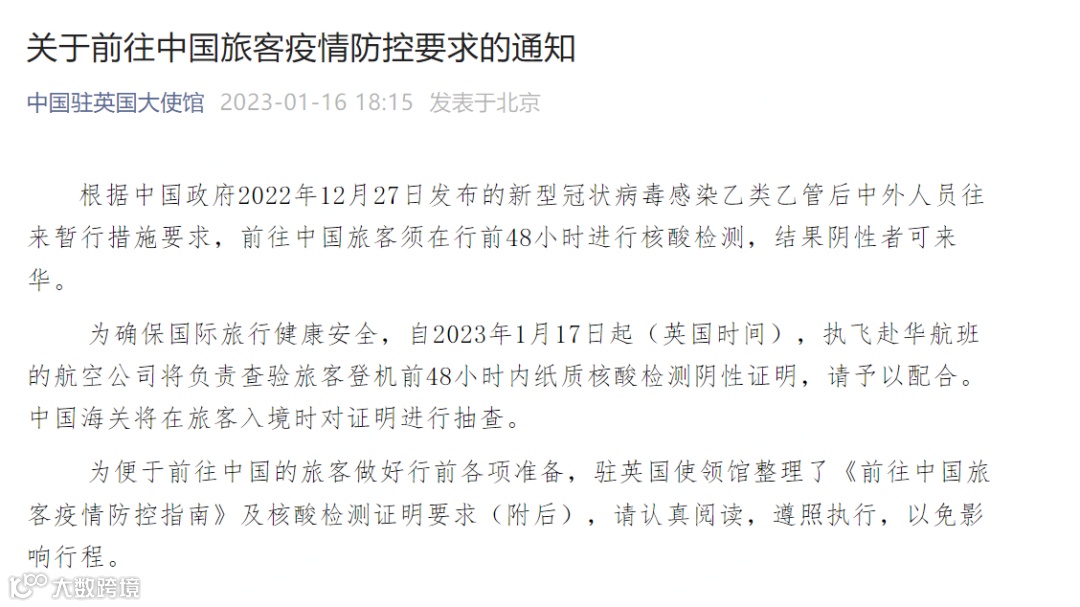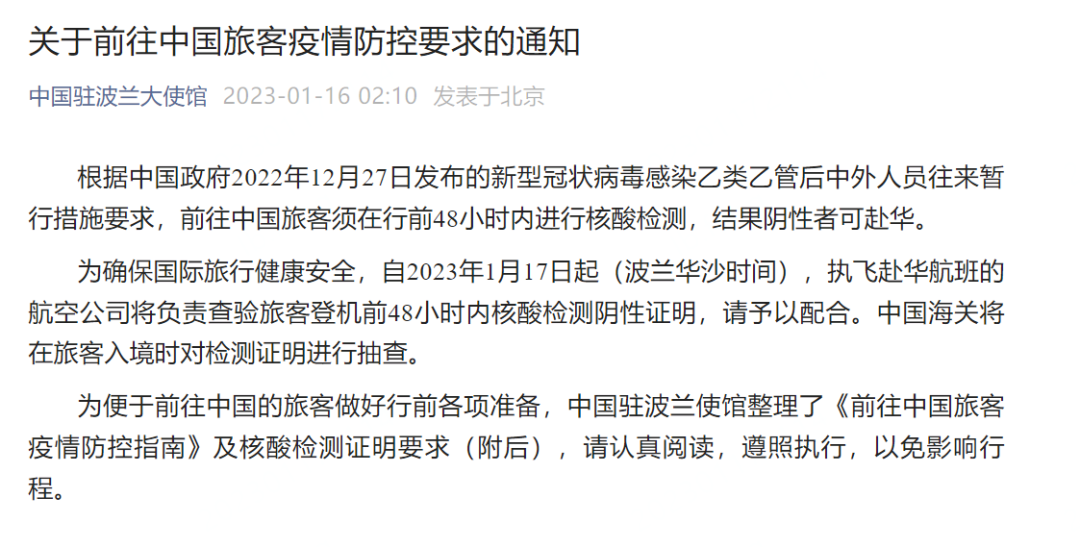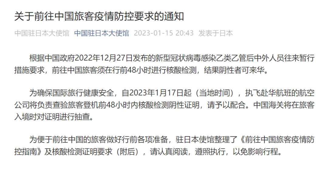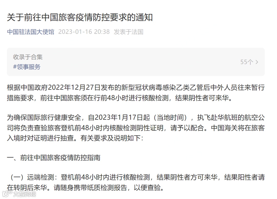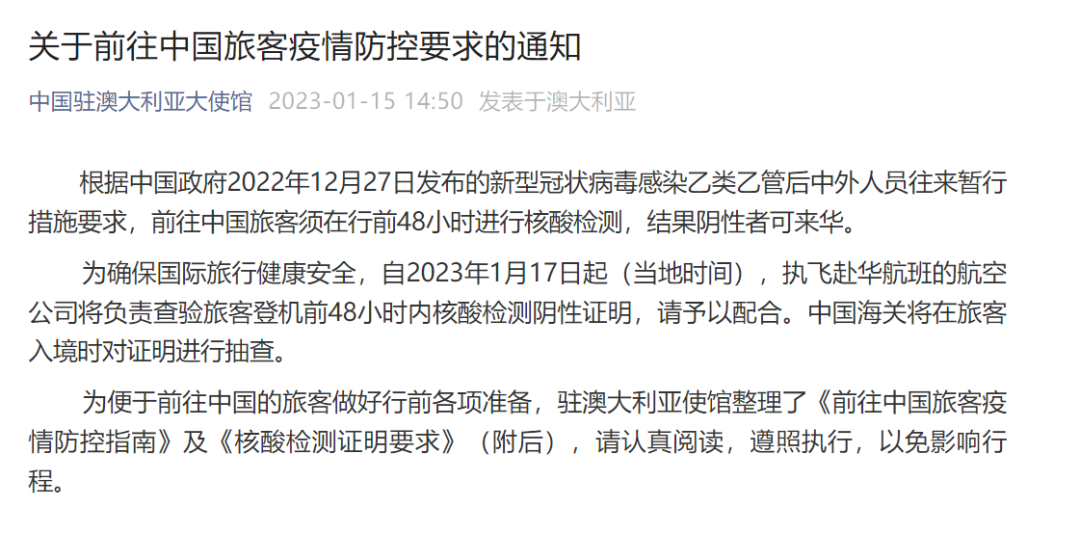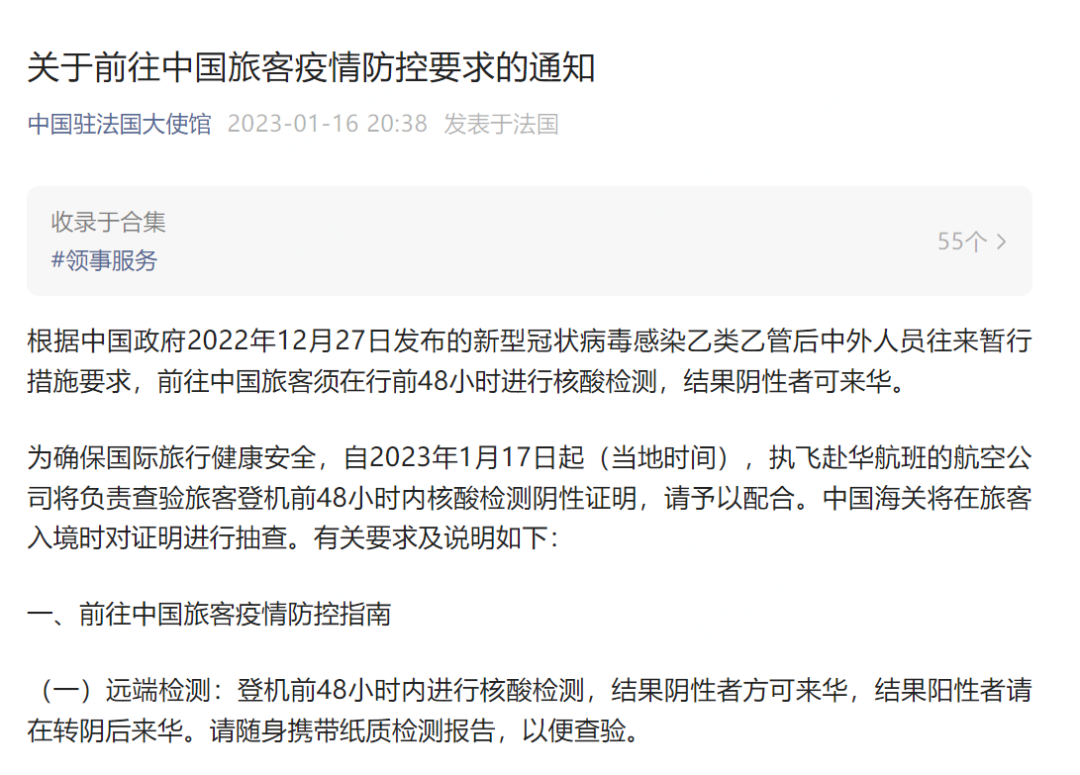 近日,中国驻各国使馆的官方号,相继发布《关于前往中国旅客疫情防控要求的通知》: