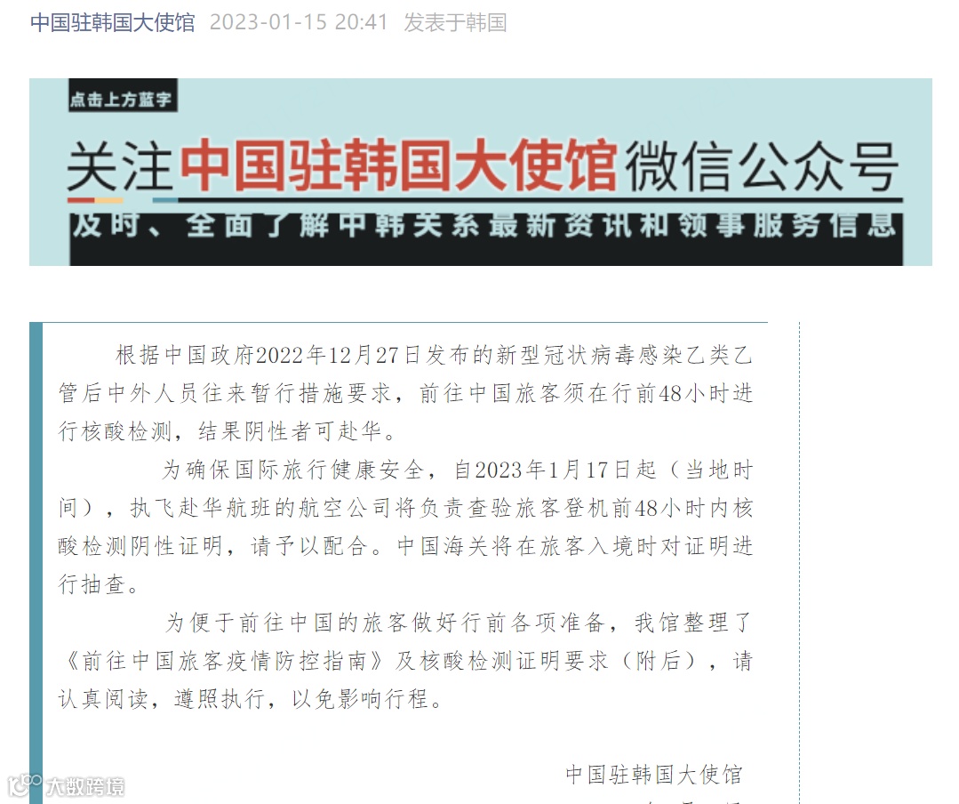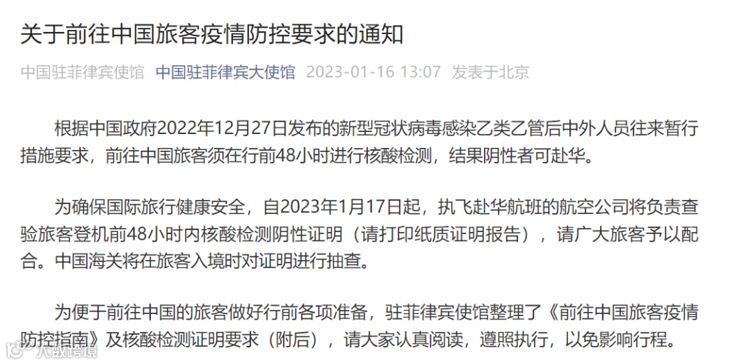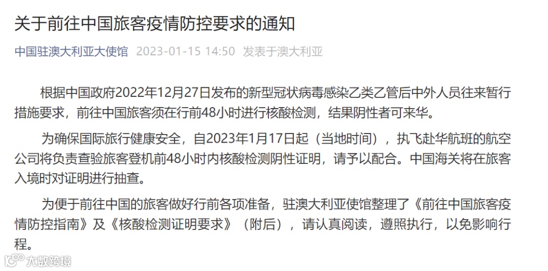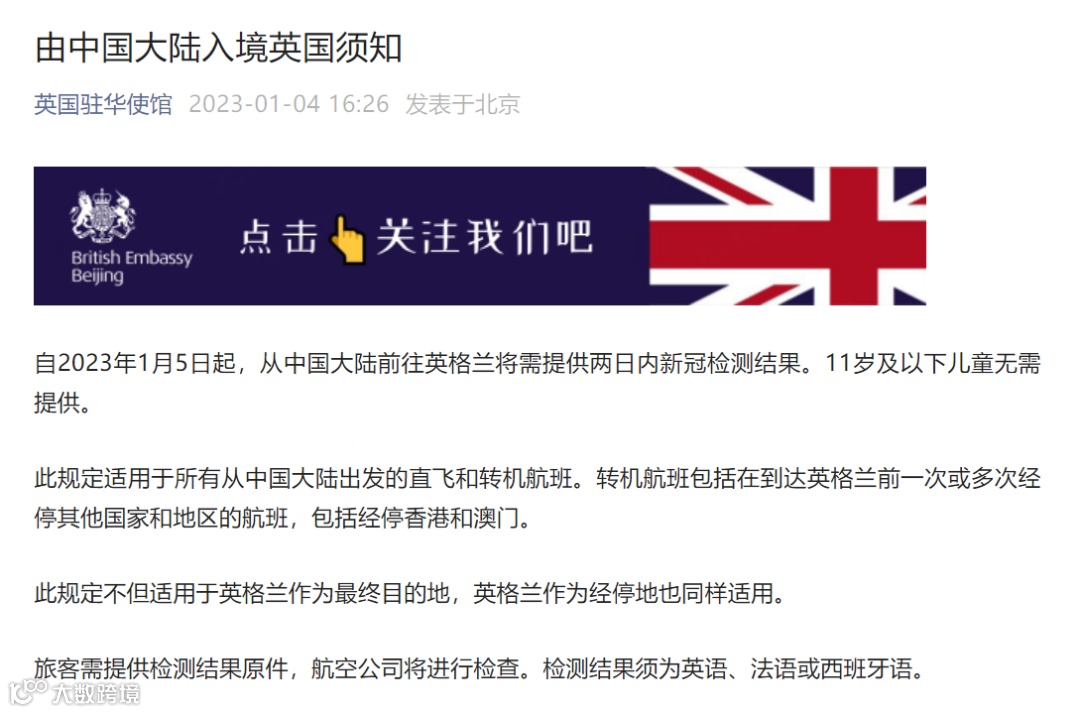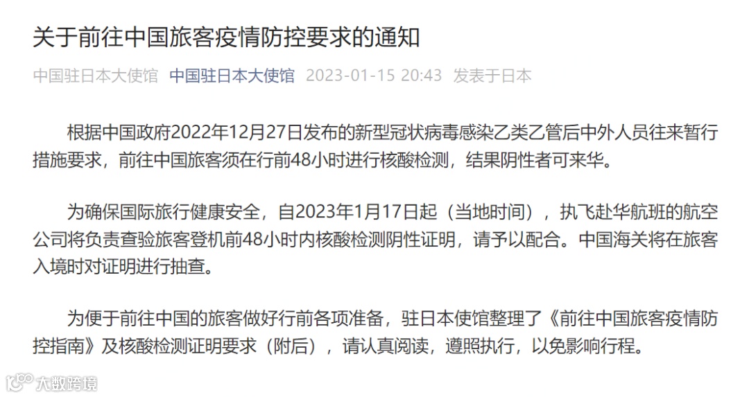近日,中国驻各国使馆的官方号,相继发布《关于前往中国旅客疫情防控要求的通知》: