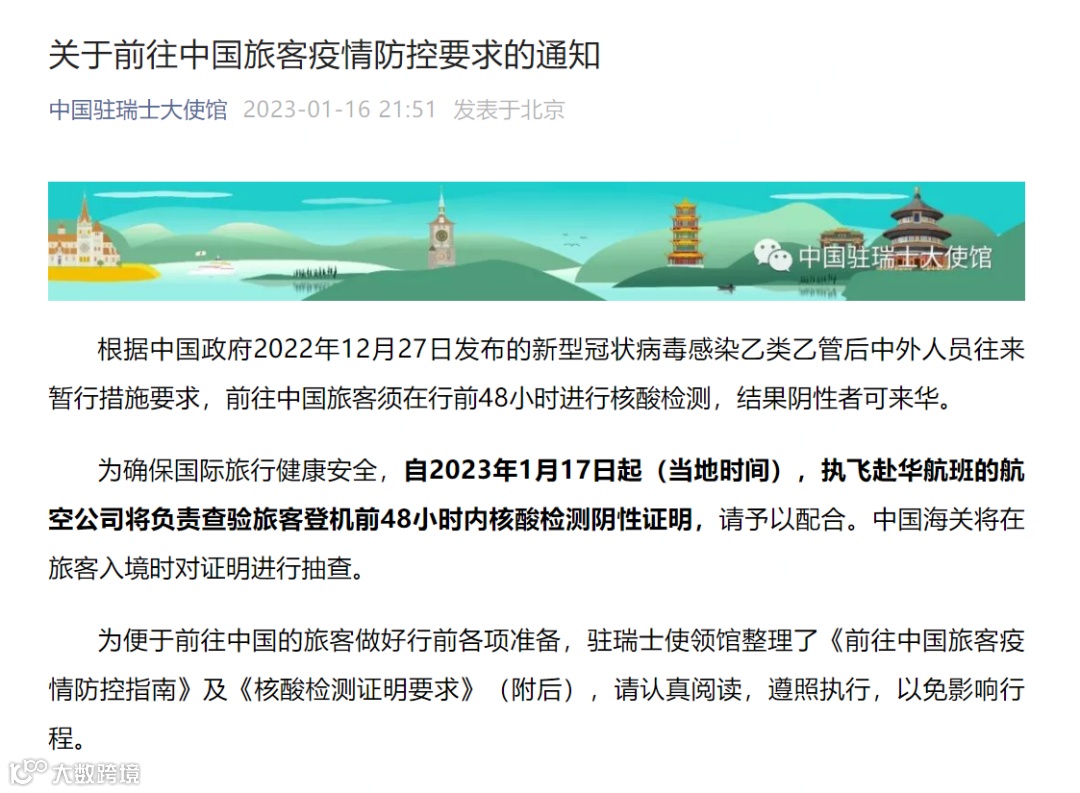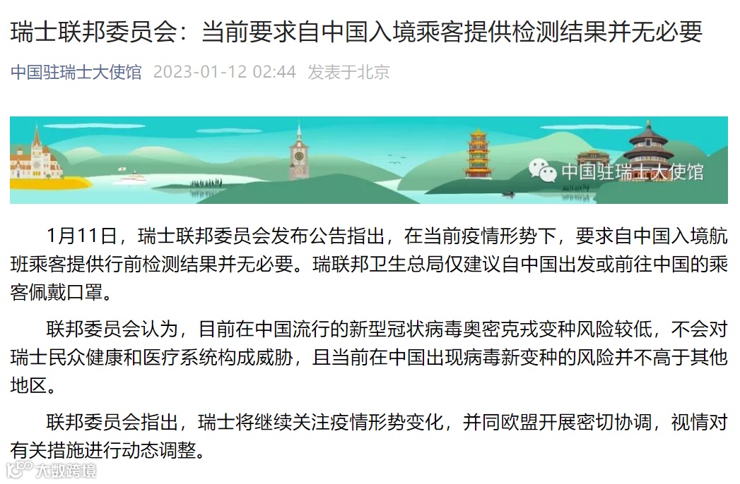 1月11日,瑞士联邦委员会发布公告指出,在当前疫情形势下,要求自中国入境航班乘客提供行前检测结果并无必要。瑞联邦卫生总局仅建议自中国出发或前往中国的乘客佩戴口罩。