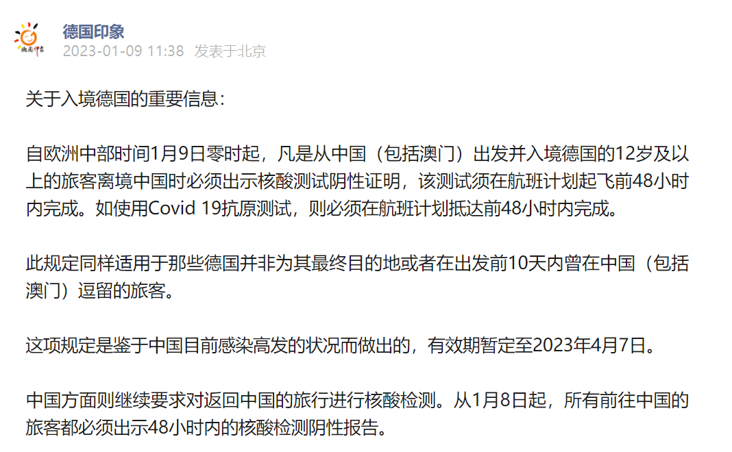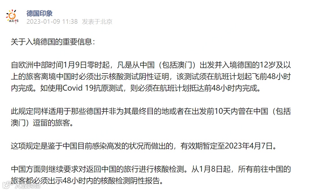 德国驻华大使馆旗下的中文资讯平台德国印象发布“关于入境德国的重要信息”