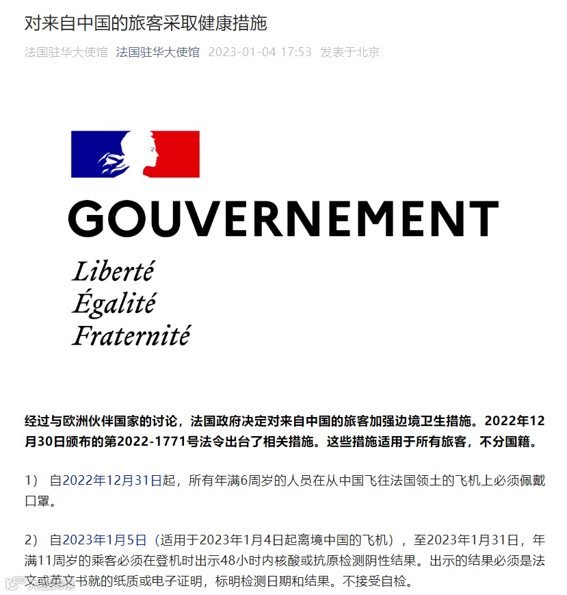 除上述要求外,自2023年1月5日起(适用于2023年1月4日离境中国的飞机),每位乘客在登机前须向其飞往法国所乘航空公司提交文件,除阴性检测结果外,还须提交一份声明,承诺如下事宜: