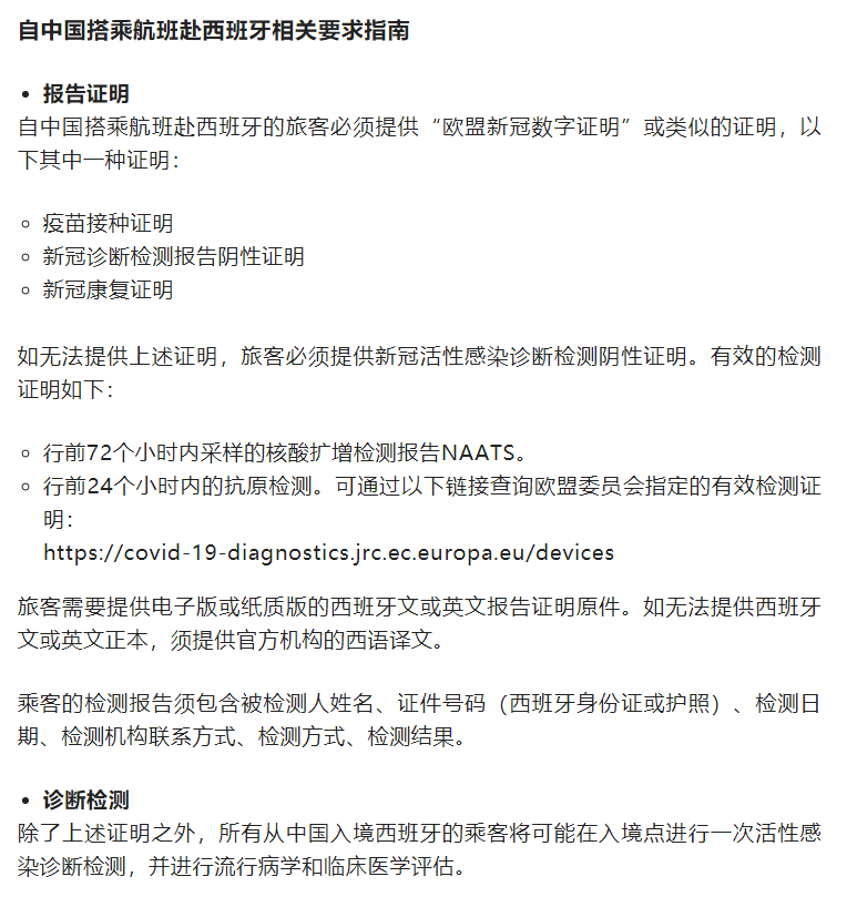 西班牙驻华大使馆发布“自中国搭乘航班赴西班牙相关要求指南”: