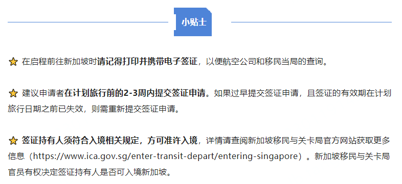 来新中国游客应根据自身情况,提前了解入境新加坡签证和防疫要求。办妥相应签证,并携带英文版的疫苗接种证书(需接种世界卫生组织认可的疫苗,12周岁及以下免除此项要求),及电子入境卡(SG Arrival Card,登机前3天在新加坡移民局网站填写后发至注册邮箱)。