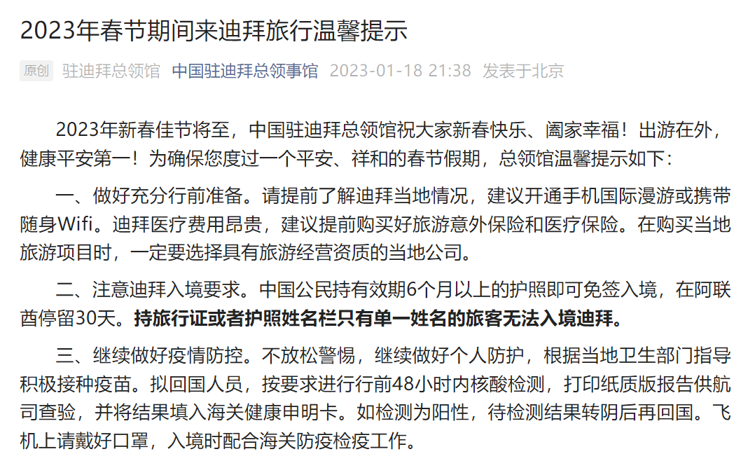 据中国驻迪拜总领事馆信息:2023年入境迪拜:免签!