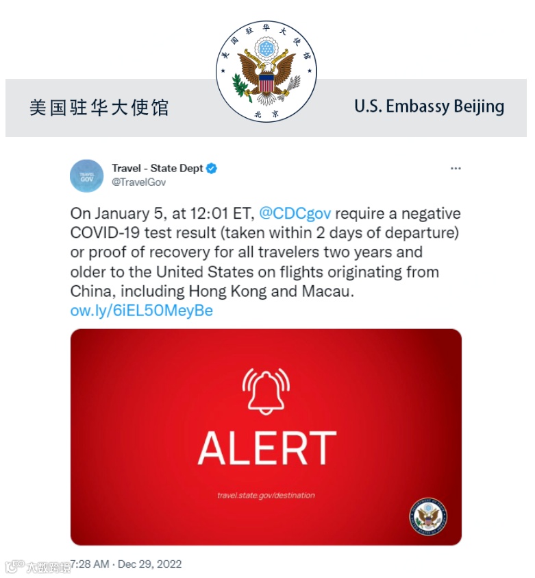 美国疾控中心要求所有乘坐从中国(包括香港和澳门)始发的航班前往美国的两岁及以上的旅客出示(出发前两日内的)阴性新冠检测结果或康复证明。