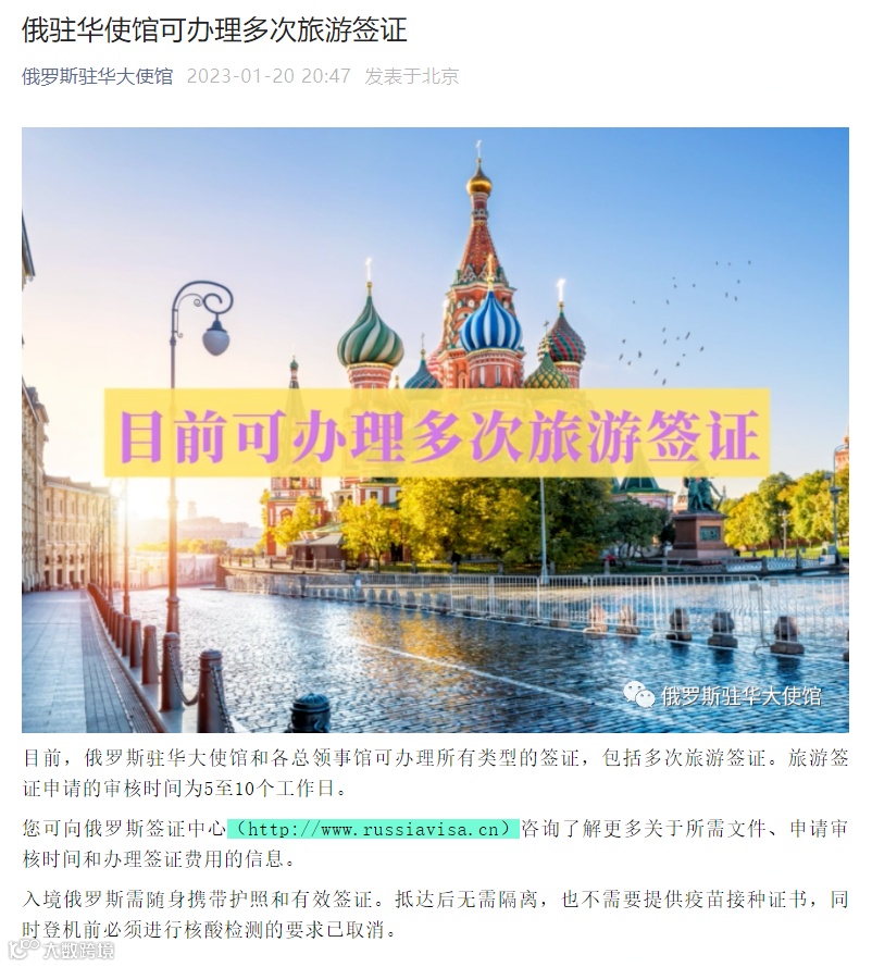 据俄罗斯驻华大使馆消息,目前,俄罗斯驻华大使馆和各总领事馆可办理所有类型的签证,包括多次旅游签证。旅游签证申请的审核时间为5至10个工作日。