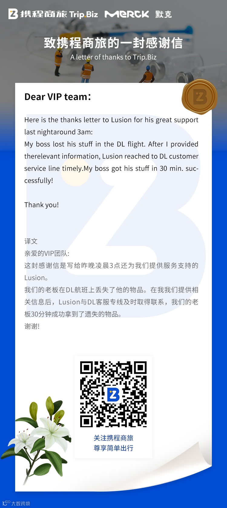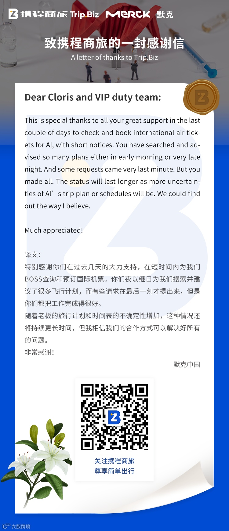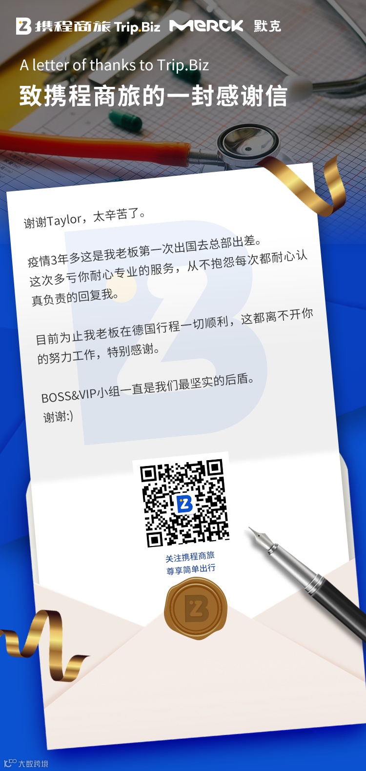 默克中国差旅负责人与携程商旅BOSS&VIP服务团队携手,为企业管理层打造一站式专属定制出行服务——针对行程变化,携程商旅服务团队能够及时响应,并快速查询差旅预订订单,根据行程计划完成订单退改,保障企业管理层行程顺利且稳定,进而为管理层带来更舒适、更方便、更省心的差旅体验。