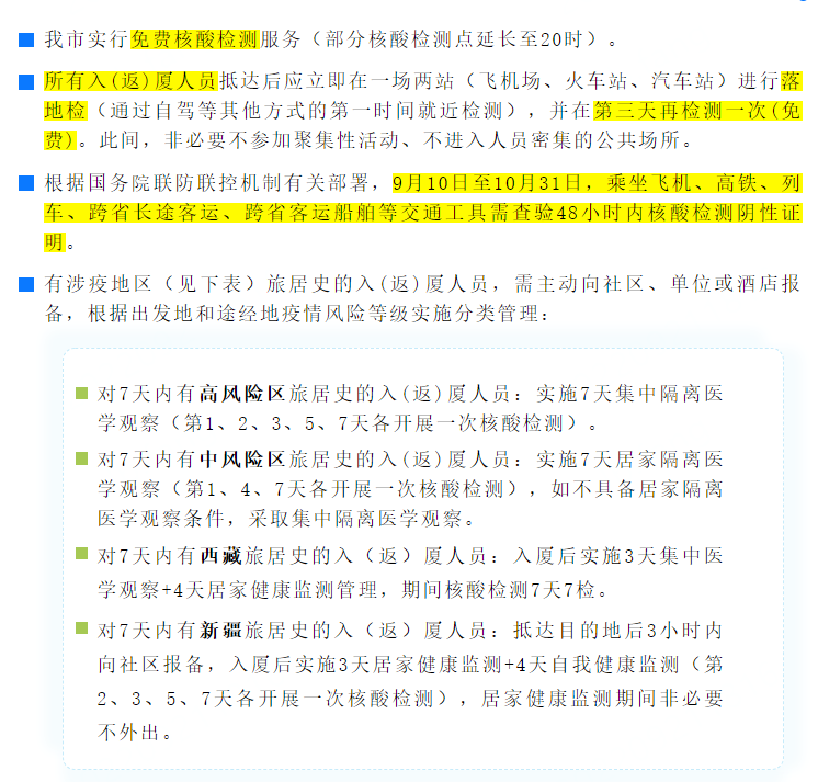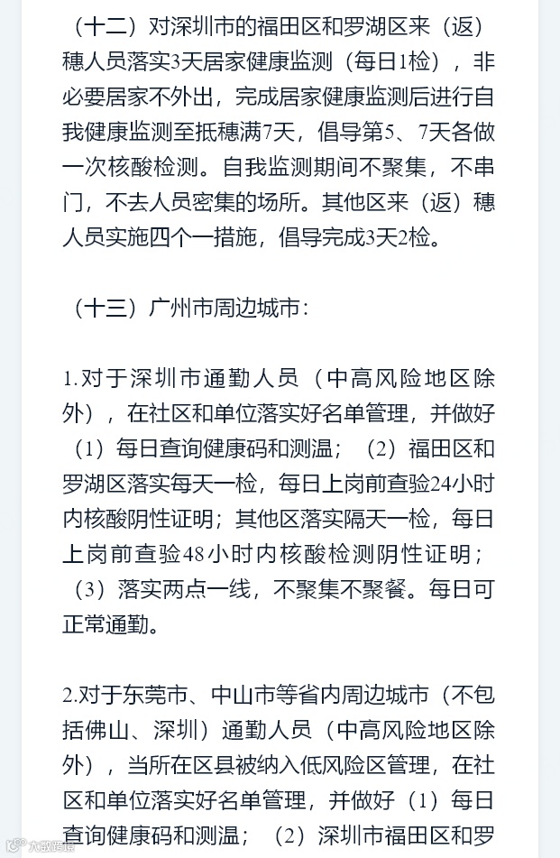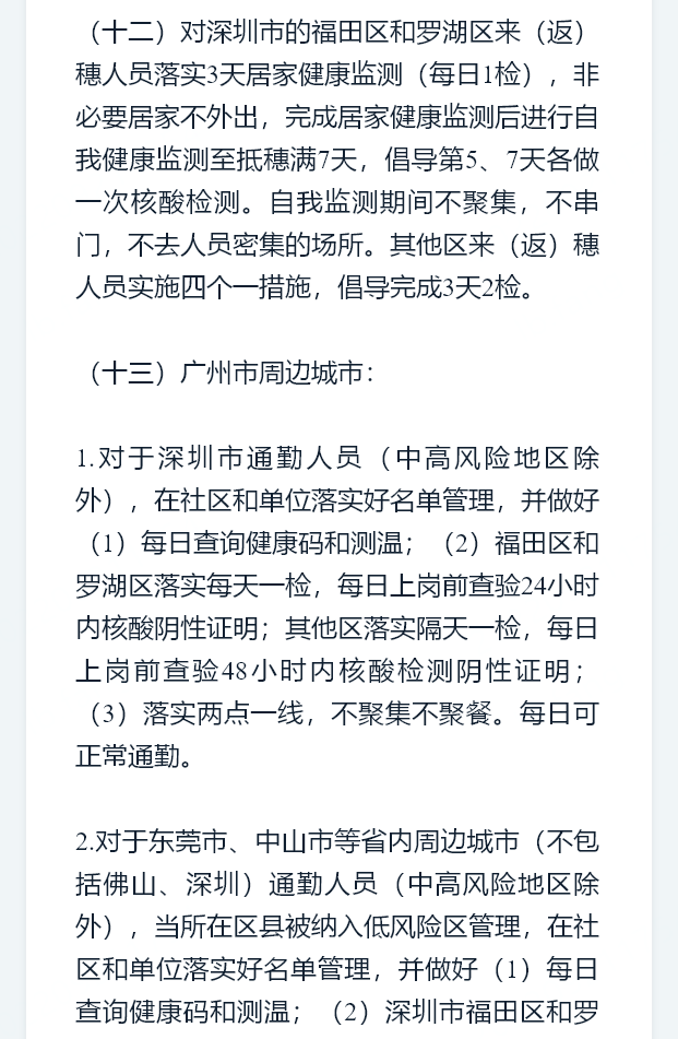 3、中高风险区所在地市来(返)深人员。实施“3 天 2 检”,即抵深24小时内完成1次核酸检测,48-72小时之内再做1次核酸检测,抵深后前3天原则上“两点(居住点和工作点)一线”,不乘坐公交车等公共交通工具,不聚集、不聚餐。