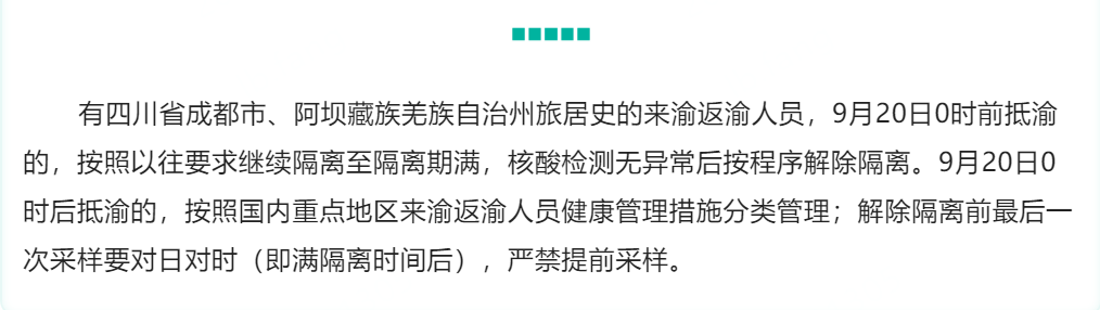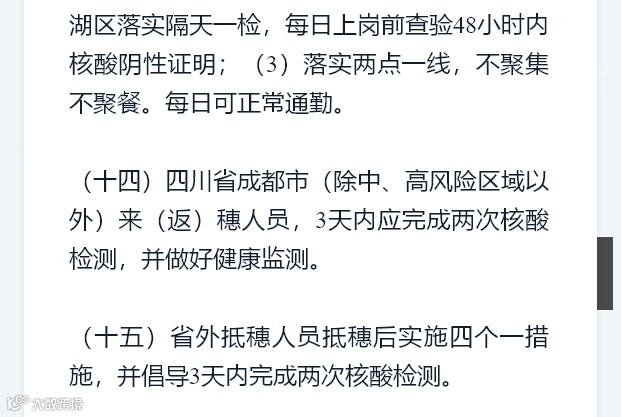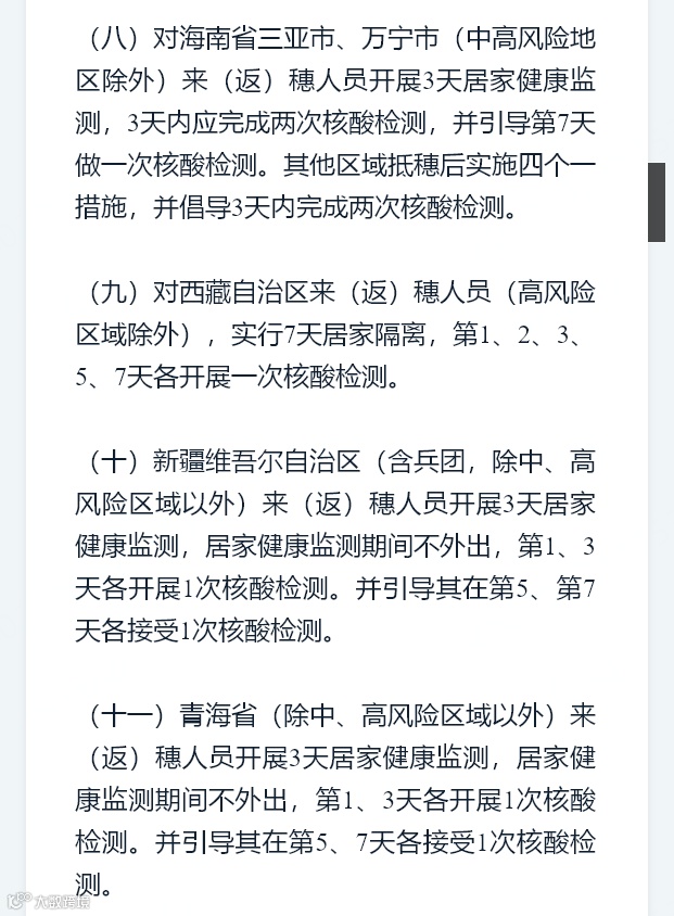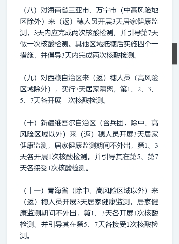 3.贵州省贵阳市、毕节市,新疆维吾尔自治区伊犁哈萨克自治州、吐鲁番市、巴音郭楞蒙古自治州,内蒙古自治区赤峰市,四川省成都市、泸州市、宜宾市、阿坝藏族羌族自治州、达州市、内江市,辽宁省大连市,黑龙江省大庆市,湖北省恩施土家族苗族自治州,江西省吉安市,广东省深圳市,广西壮族自治区防城港市,青海省海西蒙古族藏族自治州等城市中有疫情报告的县(市、区)来返郑人员实施7天集中隔离;上述城市中无疫情报告的县(市、区)来返郑人员实施7天居家健康监测。