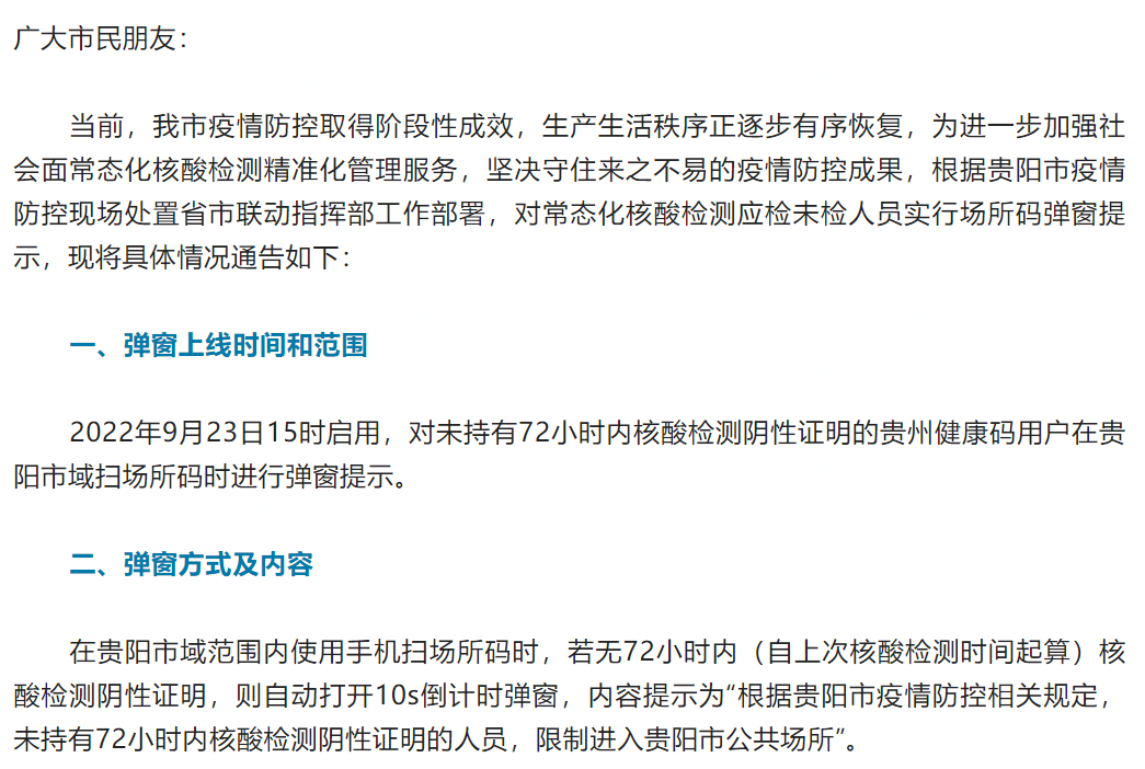 贵州发布关于在贵阳市域实行核酸应检未检人员扫场所码进行弹窗提示的公告: