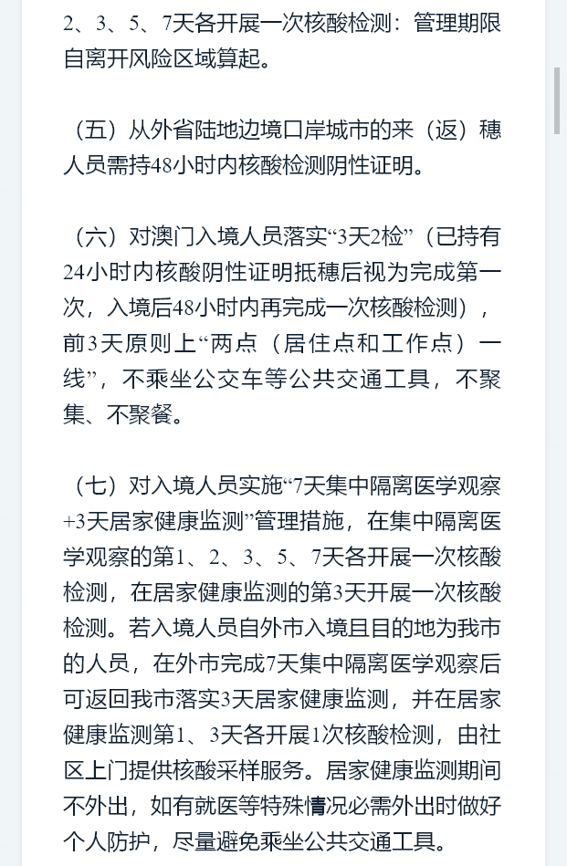 六、凡从陆地边境口岸城市入琼的人员和7天(离开低风险区之日算起)内有陆地边境口岸城市旅居史的来琼返琼人员,凭48小时内1次核酸检测阴性报告办理登机(车、船)手续;入琼后第3天开展1次检测核酸。所有来(返)琼人员抵琼关口落实测温、扫地点码、查健康码和行程卡措施,并实施落地检后放行。来琼人员,务必第一时间向所在社区(村)、单位报备,并主动配合落实核酸检测等各项防控措施。