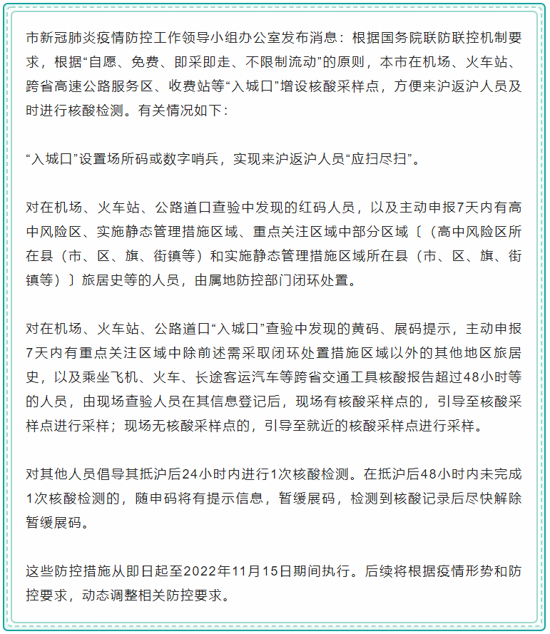 公路疫情服务站、机场、火车站、长途客运站等场所要严格落实测温、查验核酸检测阴性证明、健康码、行程卡和扫描“落地码”等防控措施,做好“落地”核酸检测工作。高速公路服务区要落实扫码、测温等防疫规定。