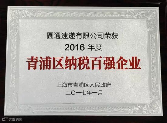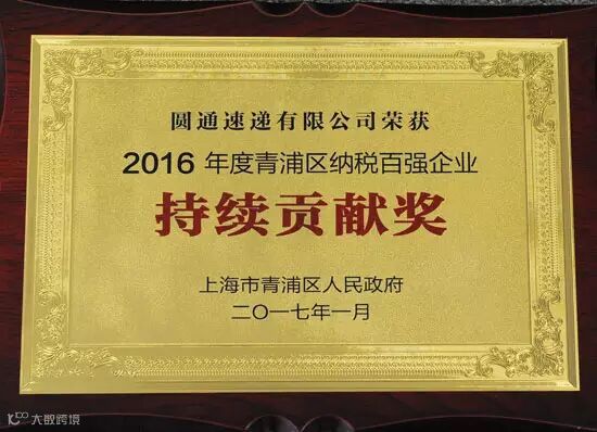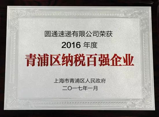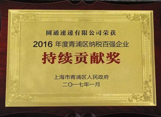 2017年1月19日,圆通速递荣获上海市青浦区政府颁发“2016年度青浦区纳税百强企业”以及“持续贡献奖”双项殊荣,这是圆通继2011至今连续六年获此殊荣,代表了青浦区人民政府对圆通速递2016年诚信经营、依法纳税、超越发展和积极履行社会责任的认同与肯定。