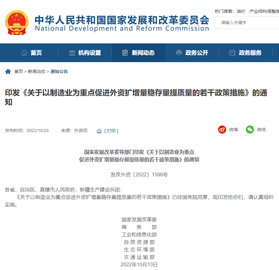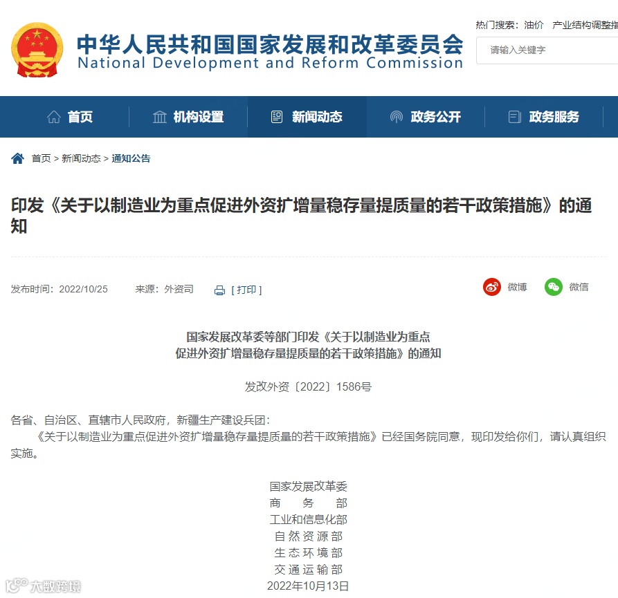 10月25日,发改委等六部门印发《关于以制造业为重点促进外资扩增量稳存量提质量的若干政策措施》。其中提出,便利国际商务人员往来。在做好新冠肺炎疫情防控前提下,便利跨国公司、外商投资企业高管、技术人员及其家属出入境。各地方要用好用足中外人员往来“快捷通道”,结合当地实际,进一步明确标准和流程,为外籍人员来华提供便利。