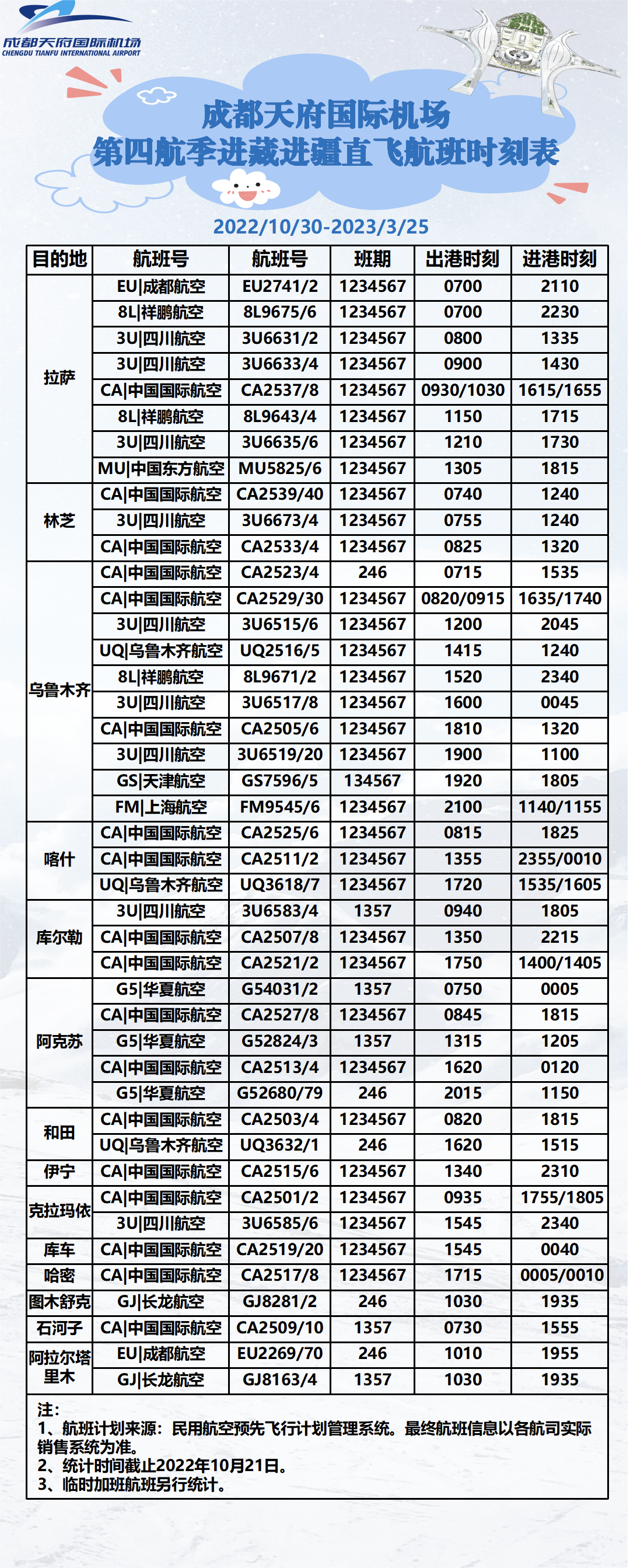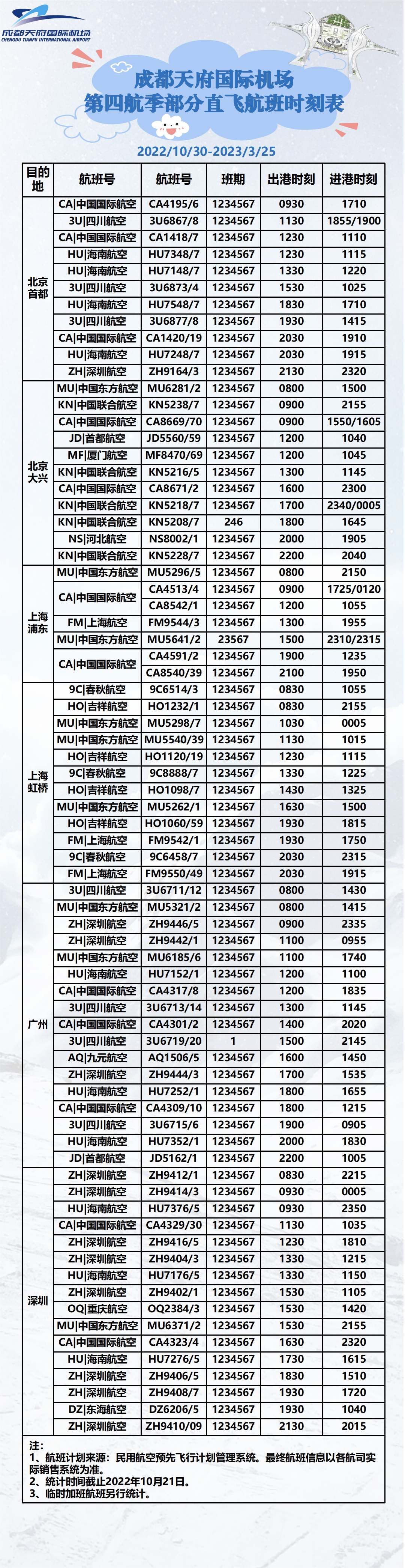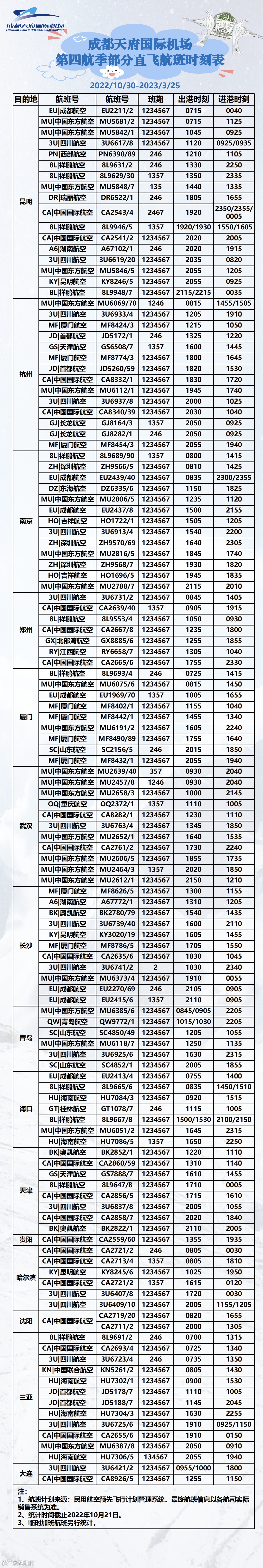 第四航季(2022年10月30日—2023年3月25日)在成都天府国际机场运营的航空公司共32家。其中,中国国际航空、四川航空、中国东方航空、成都航空4家航空公司同时在双流机场和天府机场运营;祥鹏航空、厦门航空、春秋航空、吉祥航空、长龙航空、山东航空、上海航空、青岛航空、深圳航空、海南航空、首都航空、中国联合航空、华夏航空、昆明航空、瑞丽航空、奥凯航空、多彩贵州航空、河北航空、天津航空、东海航空、乌鲁木齐航空、北部湾航空、湖南航空、江西航空、九元航空、西部航空、桂林航空、重庆航空等28家国内航空公司仅在天府机场运营。