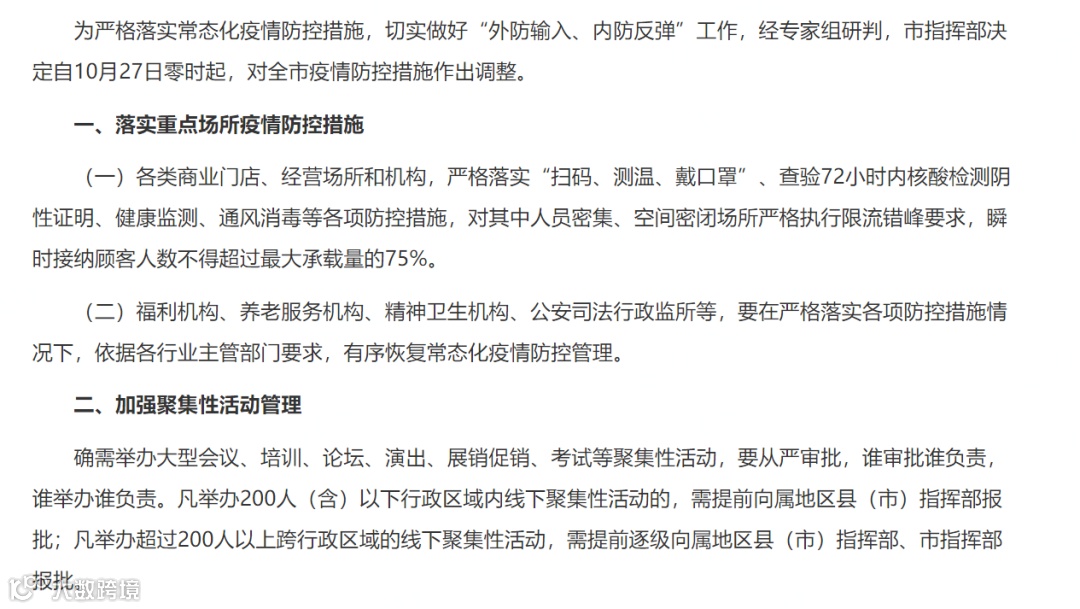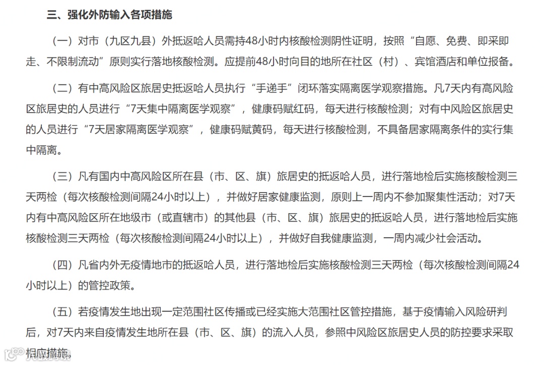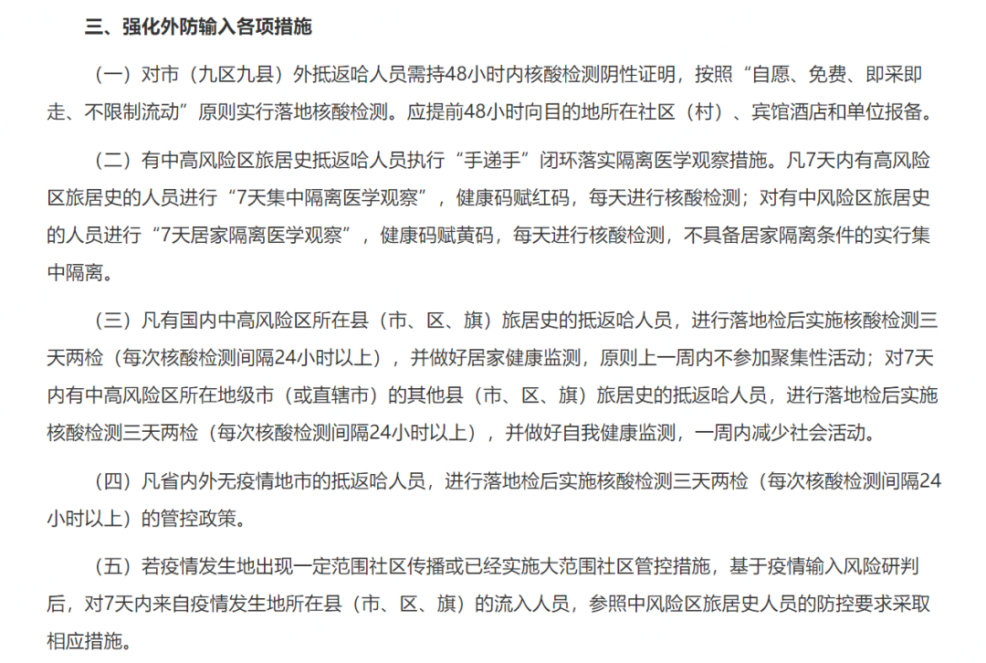 黑龙江哈尔滨:10月27日零时起开始执行,省内外抵返哈人员,实施落地检和三天两检。