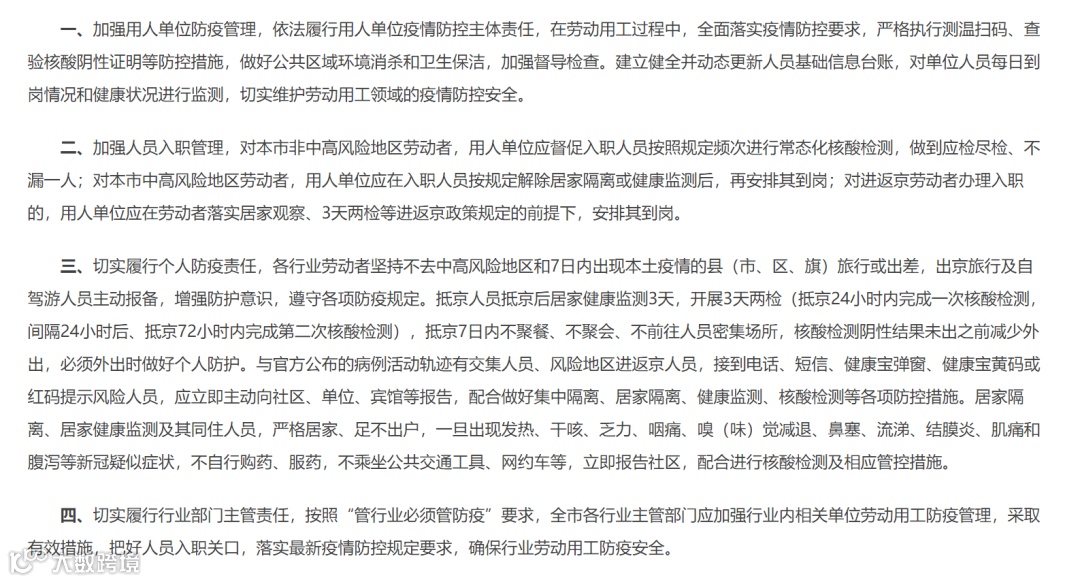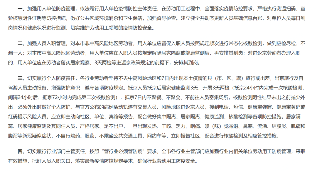 为科学精准抓好疫情防控北京市人力资源和社会保障局关于做好当前劳动用工领域疫情防控工作的通告。其中指出,
