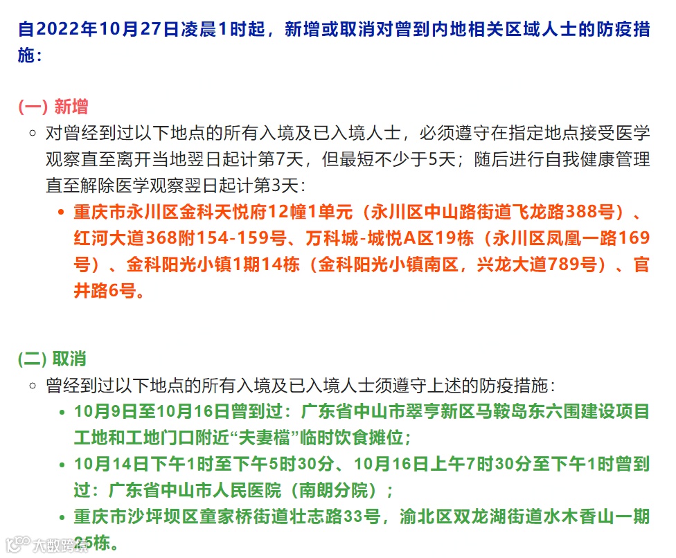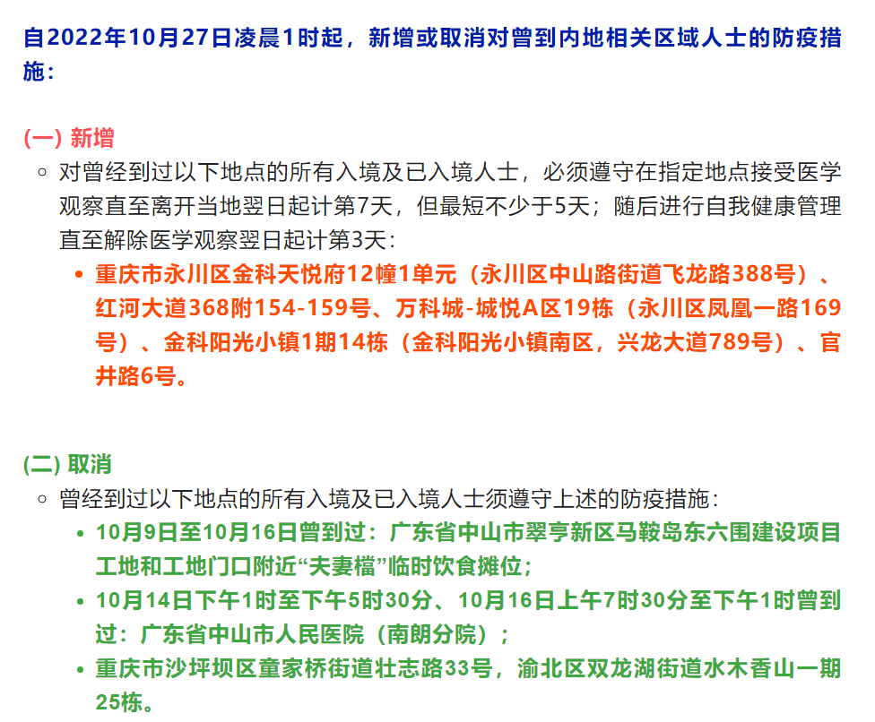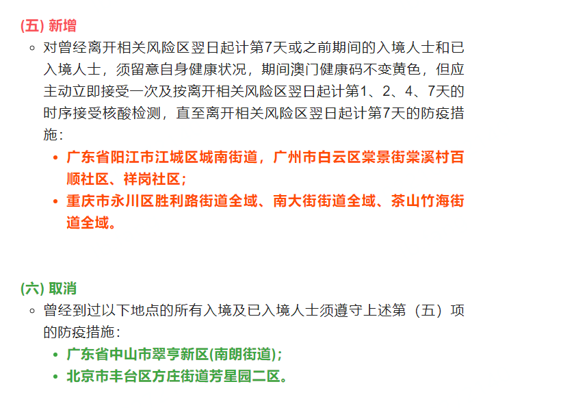 10月27日凌晨1时起,澳门新增或取消对曾到内地相关区域人士的防疫措施。具体信息如下: