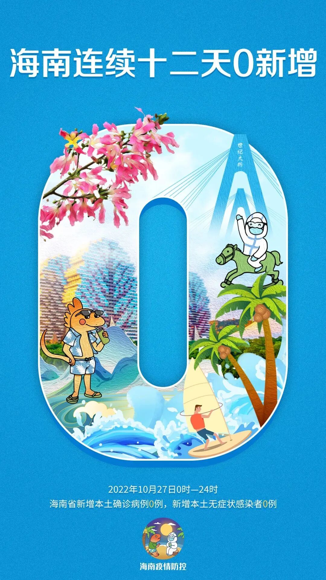 2022年10月27日0时—24时,海南省无新增感染者,海南连续12天0新增。
