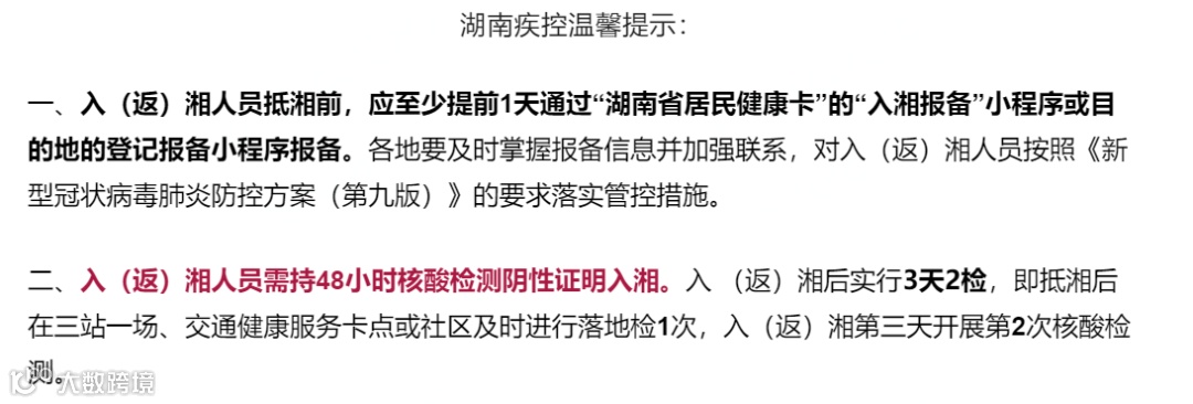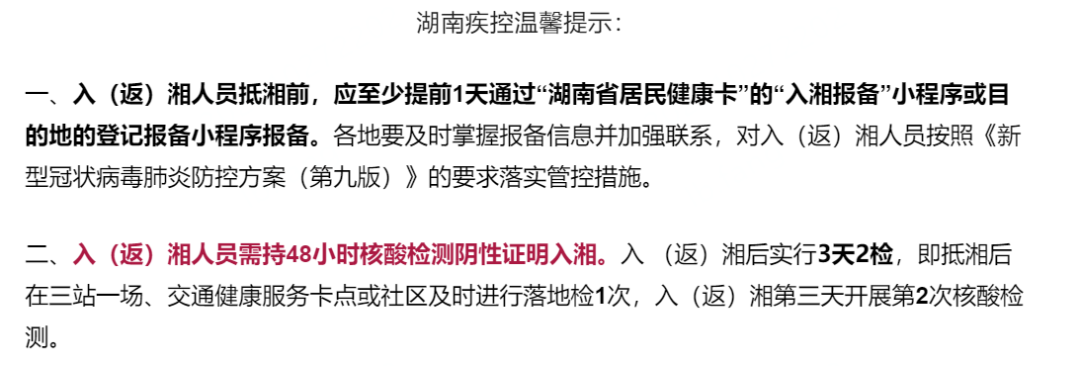 湖南:入(返)湘人员需持48小时核酸检测阴性证明入湘。入 (返)湘后实行3天2检,以及落地检。