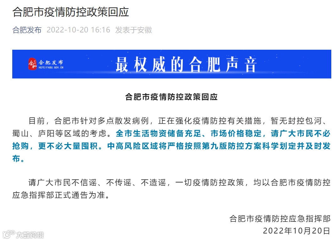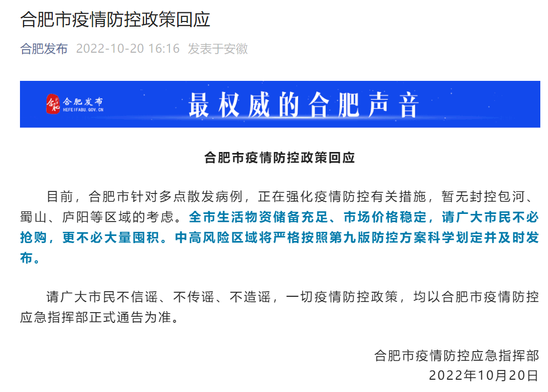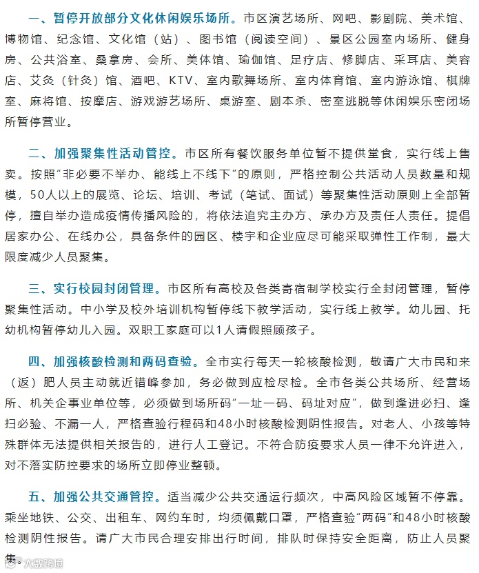 合肥发布加强市区疫情防控工作通告:主要针对风险地区强化管控,暂无其他调整。