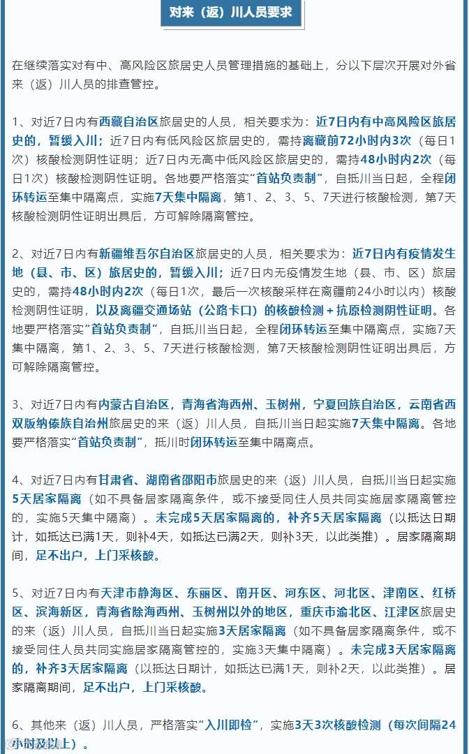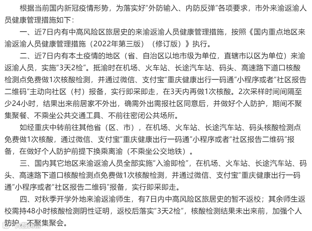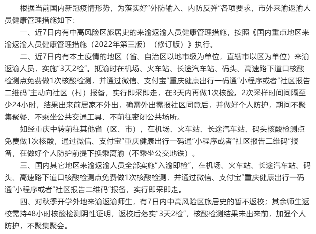 根据重庆疾控发布,重庆依然主要实施“三天两检”和“落地检”,来返人员的管控要求,与其他各地相比较为宽松。