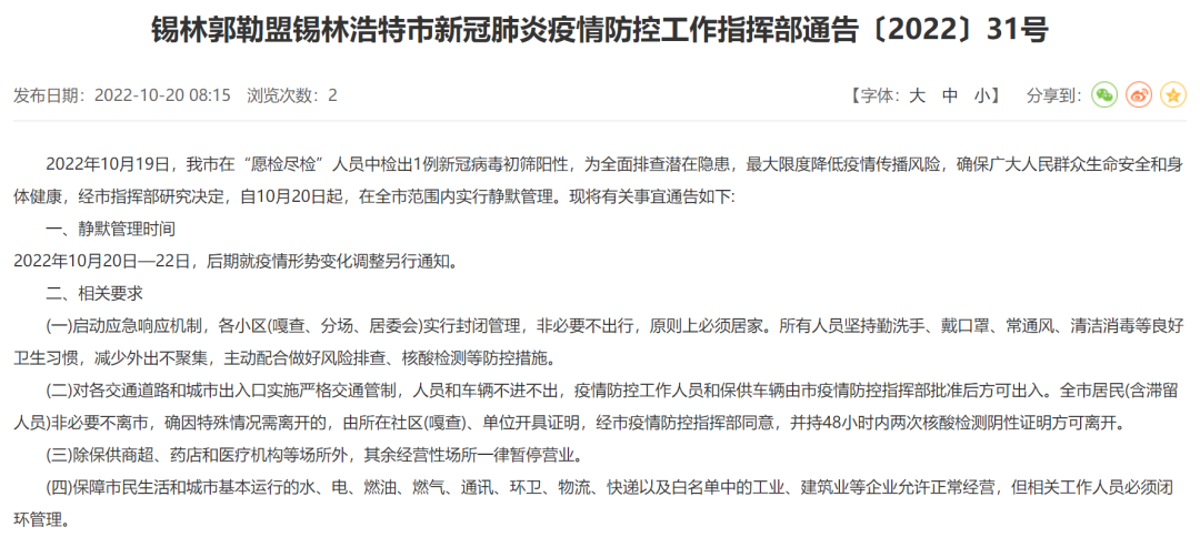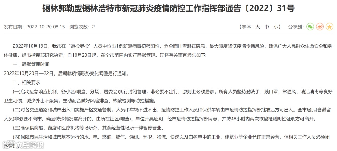 根据内蒙古人民政府网消息,10月20日至22日,锡林郭勒实行静默管理。