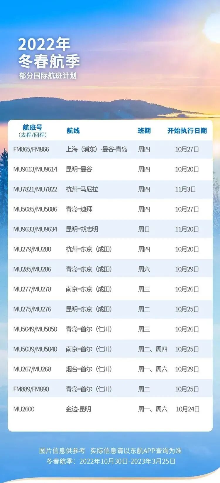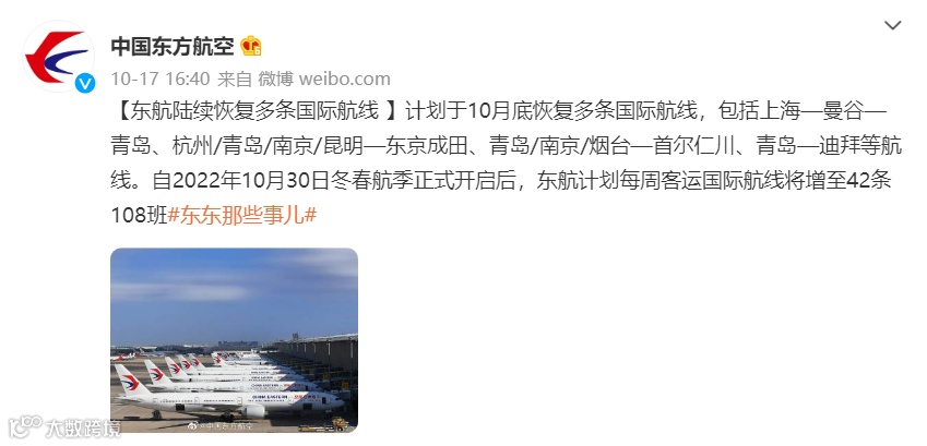 东航官宣,计划于10月底恢复多条国际航线,包括上海—曼谷—青岛、杭州/青岛/南京/昆明—东京成田、青岛/南京/烟台—首尔仁川、青岛—迪拜等航线。自2022年10月30日冬春航季正式开启后,东航计划每周客运国际航线将增至42条108班。