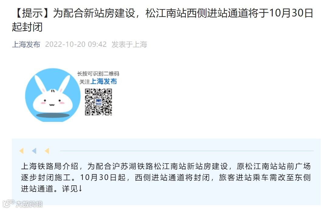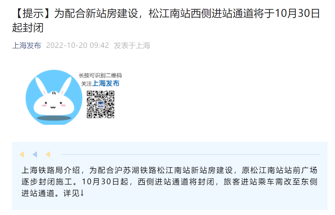 据上海铁路局消息,为配合沪苏湖铁路松江南站新站房建设,原松江南站站前广场逐步封闭施工。10月30日起,西侧进站通道将封闭,旅客进站乘车需改至东侧进站通道。