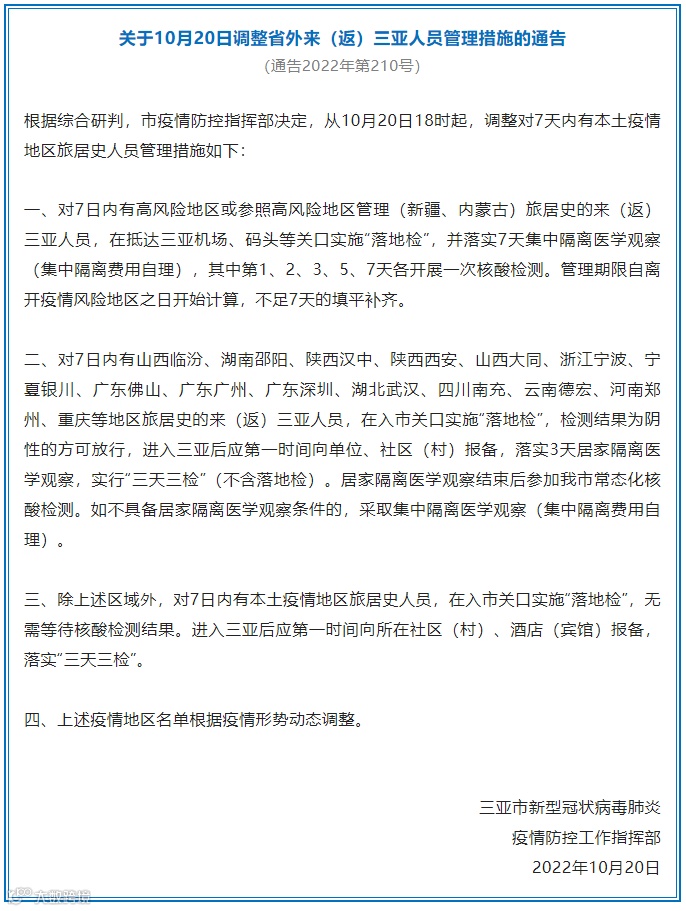 海南疫情逐渐稳定受控,三亚调整来返人员管理措施,实施“落地检”和“三天三检”。