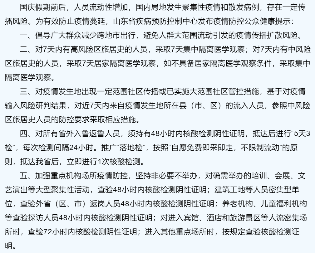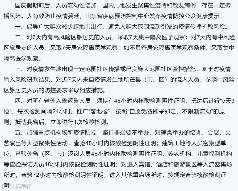 山东疾控发布防疫政策暂无变化:依然是48小时内核酸检测阴性证明,但实行抵达后进行“5天3检”的政策。