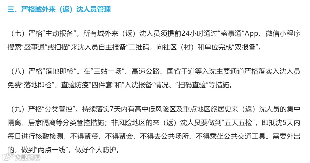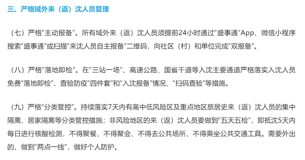 根据沈阳发布消息,沈阳严格实行“落地检”,同时采取“五天五检”管理措施。