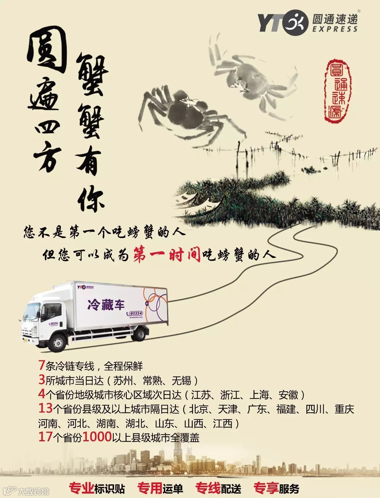 与此同时,圆通速递新开了7条冷链专线,覆盖全国13个外围省份;并在大闸蟹包装箱上贴有“生鲜专递,优转优派”和“小心轻放禁止倒置”等专用标识贴,全程优先收入、转运、派送,全程专用运单、专人跟踪,进一步保障运营。
