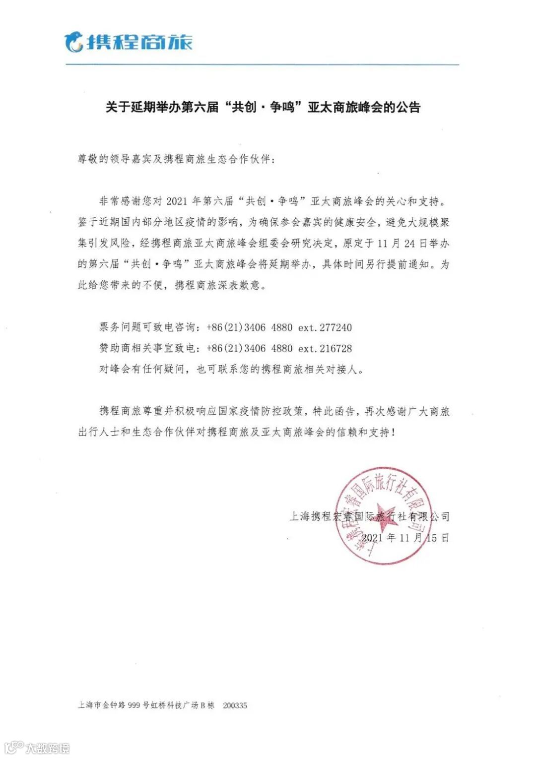 无奈疫情反复情况严重,为了响应国家《新型冠状病毒肺炎防控方案》的管理与号召,避免大规模聚集引发风险,更重要的是为了保障所有线下与会嘉宾的健康安全。经携程商旅亚太商旅峰会组委会慎重研究,最终作出延期决定: