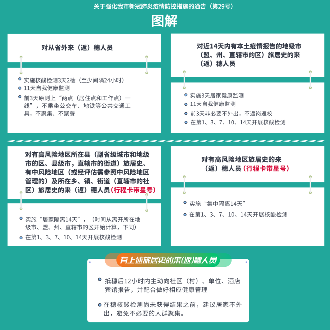 五、机场和港口区域与入境人员或货物有直接接触的服务保障人员、隔离场所、定点医院、发热门诊、冷链相关企业等高风险岗位人员尽量避免出行,确需出行的须满足脱离工作岗位14天以上且持48小时内核酸检测阴性证明,并提前3天向目的地社区(村居)报备,返乡后非必要不外出、不聚集。