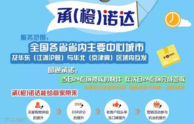 3月份,圆通速递发布消息称公司推行“承(橙)诺达”服务,范围覆盖全国主要省份的各大中心城市以及华东区域的江、浙、沪、皖--华北区域京、津、冀互发,承诺在当日24点前揽收的快件,在次日24点前完成签收。如果超出承诺的时间,圆通将给予商家一定的赔偿。
