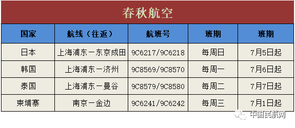 7月,春秋航空每周可执行国际航线共计4条,具体航班计划如下。(来源:中国民航网)