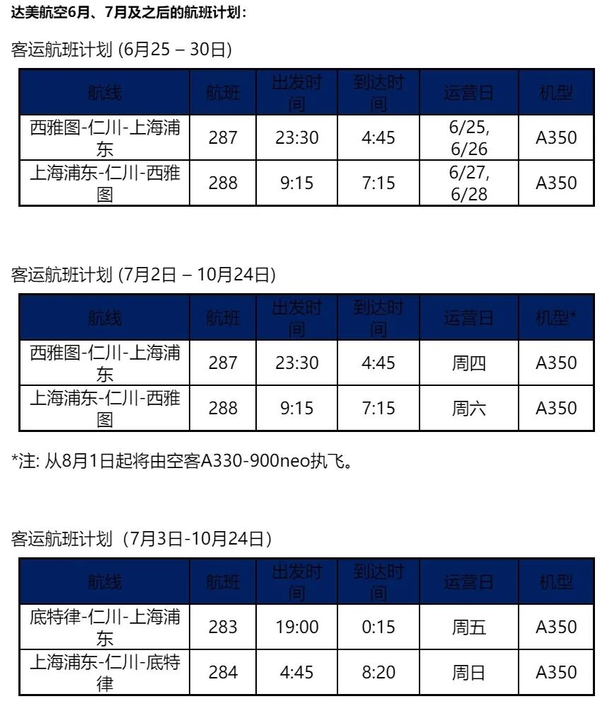 达美航空公司6月22日宣布将于6月25日恢复西雅图-上海浦东航线,该航线经停首尔仁川机场,每周运营两班。其后7月起,达美航空将运营西雅图-上海浦东、底特律-上海浦东航线,该航线同样经停仁川机场,每周运营一班。