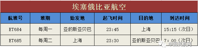 7月1日-7月31日期间,计划每周运营亚的斯亚贝巴=上海航线,具体安排如下。(来源:中国民航网)