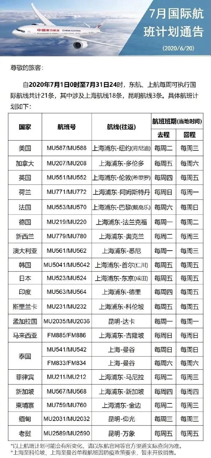 7月东航、上航每周可执行国际航线21条,其中涉及上海航线18条,昆明航线3条。(来源:东航官网)