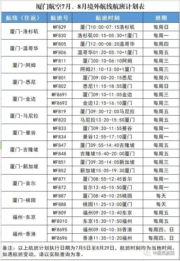 7月5日-8月29日,厦门航空计划运营以下航班。(来源:中国民航网)