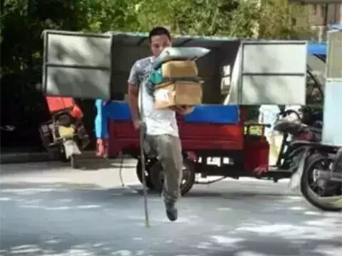 一个背影,感动一座城。这是一个独腿站立的特殊背影,主人公一手拄拐杖一手拿包裹,每天“独行”在怡和新城,一个人平均要送100件包裹。