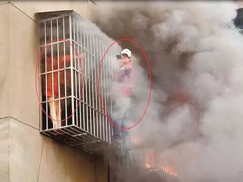 楼房着火,一名女子被困,张洋徒手爬上三楼阳台,在浓烟中用肘部撞开防盗网,将女子救下。