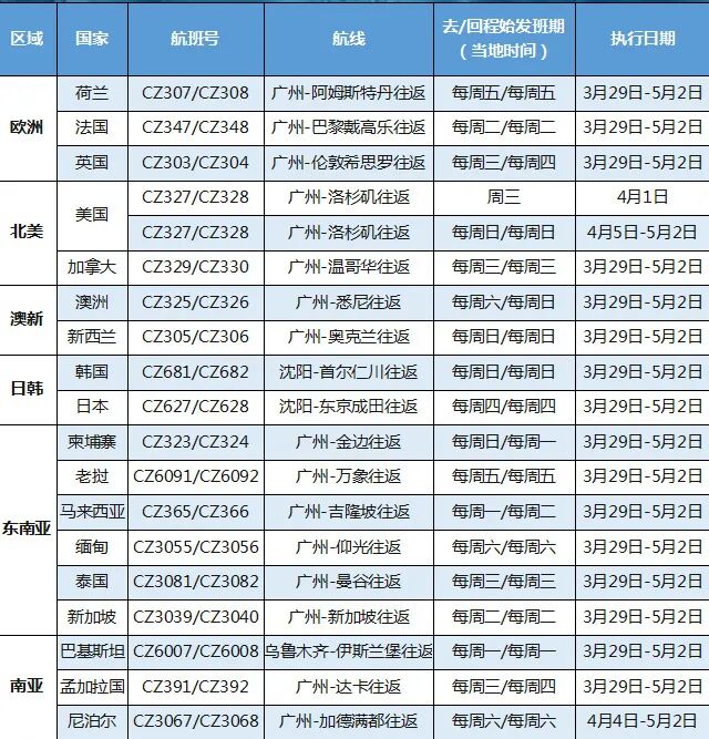 自3月29日零时至5月2日24时,南航国际航班计划如下。
