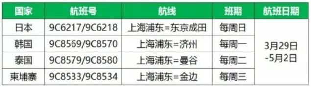 3月29日-5月2日期间春秋航空仅保留以下国际航班。