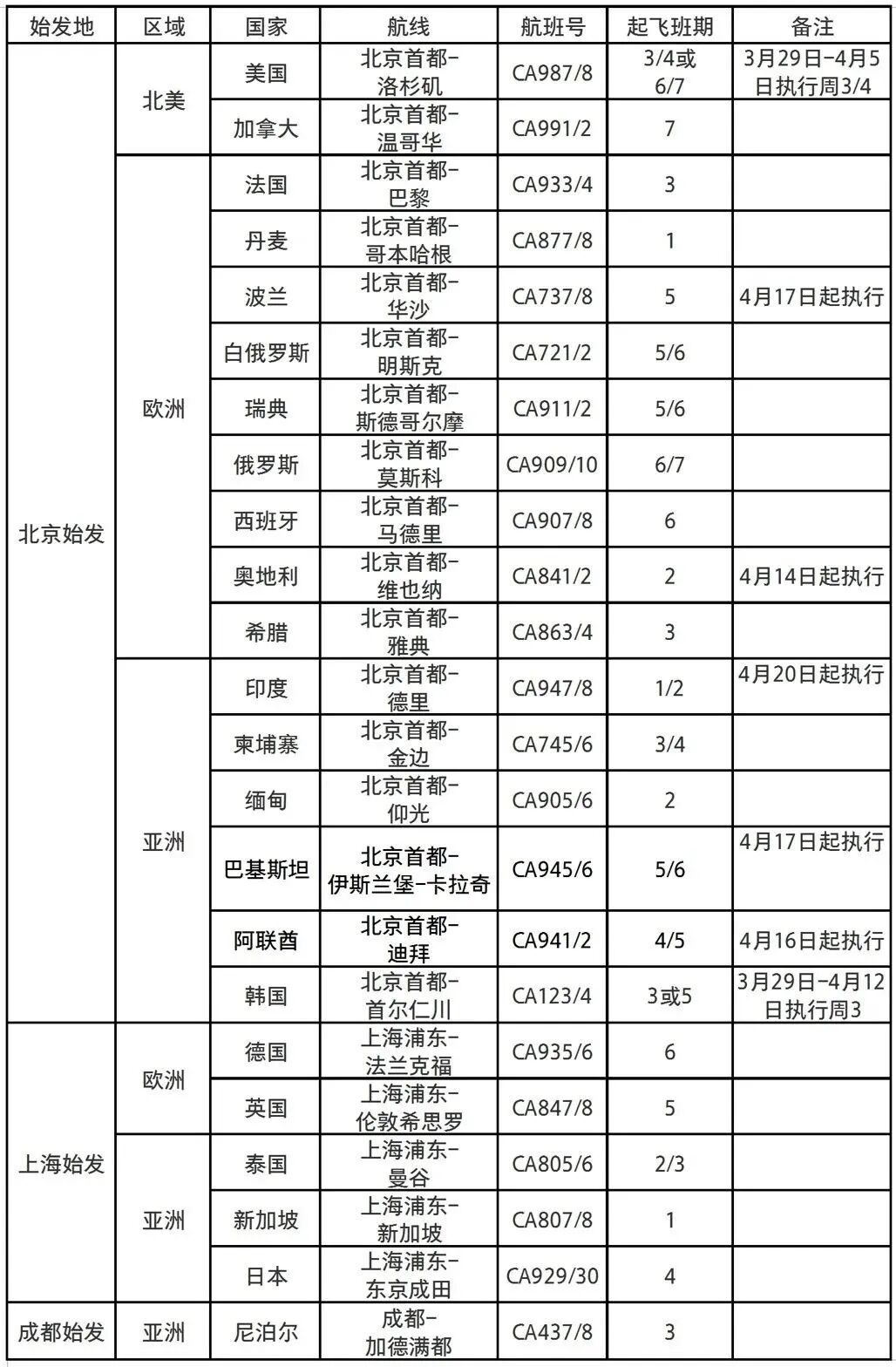 中国国际航空:自3月29日0时至4月30日24时执行以下航班计划