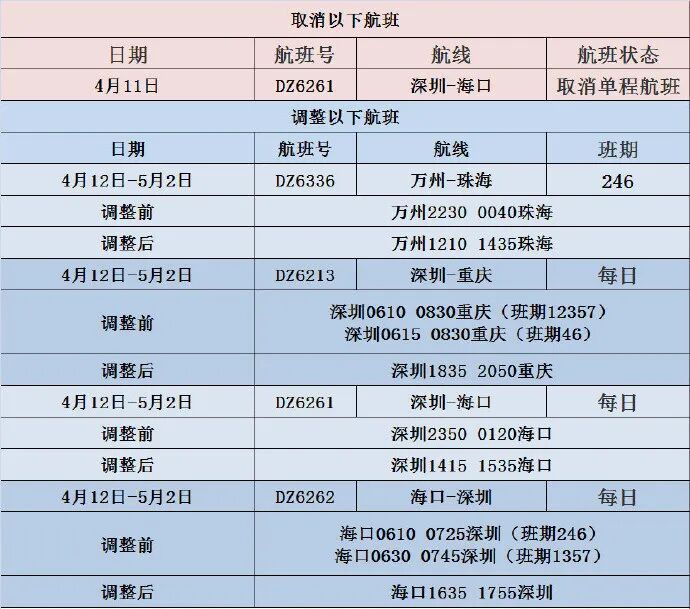 东海航空:东海航空4月3日微博宣布调整以下航班。