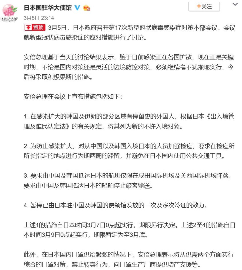 上述1的措施自日本时间3月7日0点起实行,期限另行决定。上述2至4的措施自日本时间3月9日0点起实行,期限暂定为至3月底。(来源:日本国驻华大使馆官方微博)