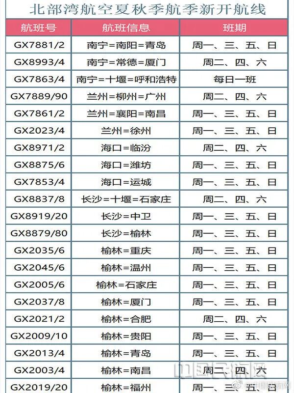 北部湾航空:自5月3日起,北部湾航空将执行2020年夏秋航班计划,航班数量及航线布局均有所调整。北部湾航空计划新增海口=临汾、南宁=南阳=青岛、海口=潍坊、兰州=柳州=广州、南宁=十堰=呼和浩特、榆林=重庆、长沙-榆林等21条航线,重开长沙=临沂、南宁=怀化=青岛等2条航线。(来源:中国民航网)