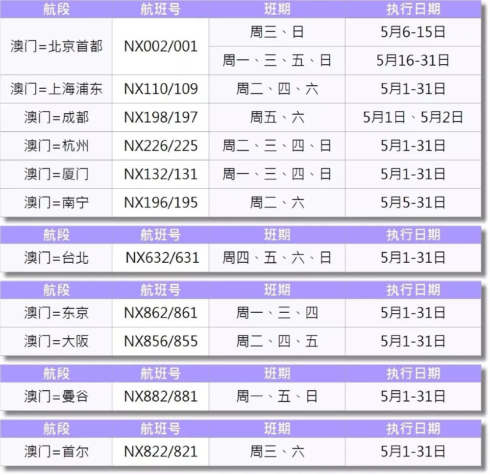 澳门航空:4月23日在官方微信发布5月1日-31日最新航班计划,具体如下。(来源:澳门航空官方微信)
